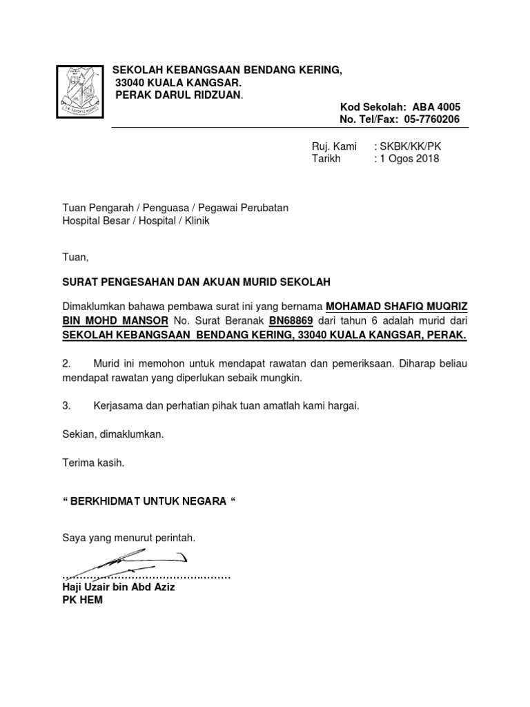 Contextual translation of surat pengesahan mendapat rawatan into English. Kebimbangan pandemik Covid -19 yang semakin menular di kawasan sekitar. Maka boleh gunakan contoh surat tidak hadir ke sekolah kerana sakit ini.