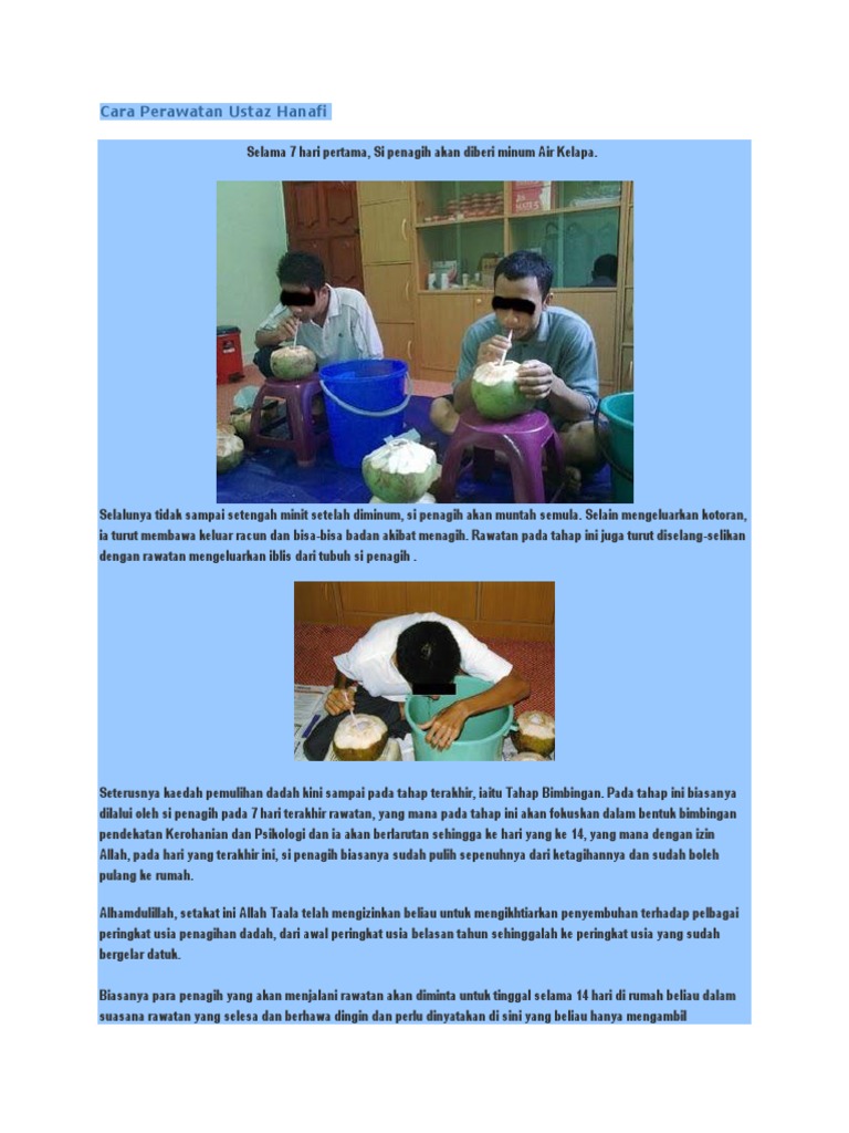 Apabila diberitahu tentang cara rawatan secara rohaniah yang ditawarkan oleh Ustaz Hanafi aku rasakan inilah rawatan yang aku perlukan. Pelaris Perniagaan - RM 50 7. Klien diberi rehat seketika lebih kurang 15-20 minit.